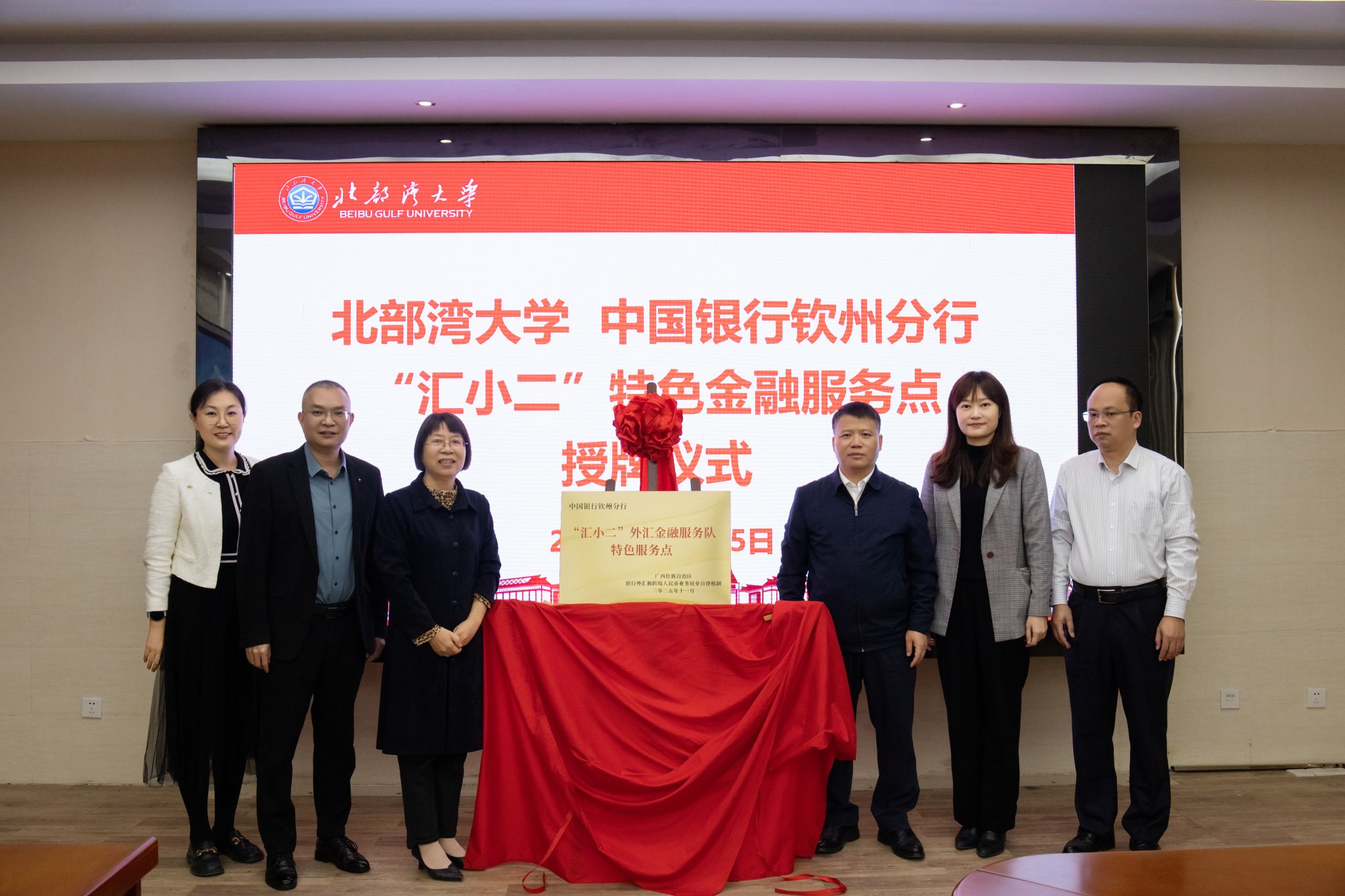 2025年11月25日上午,中国人民银行钦州市分行(国家外汇管理局钦州市分局)、中国银行钦州分行到访我校,共同举行“汇小二”特色金融服务点揭牌仪式。中国人民银行钦州市分行行长王海全、中国银行钦州分行行长石蕾、北部湾大学党委常委、副校长陆衡出席仪式并共同见证授牌。